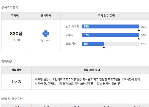 저번 달 봤던 PCCE에서 Lv. 2를 받은 뒤 세운 목표는 다음 시험에서 Lv. 3를 달성하고 PCCE를 졸업하는 것이었다. 바로 다음 시험을 지난 수요일에 치뤘는데, 목표를 달성할 수 있었다. 전체적인 문제 풀이 시간도 단축할 수 있었고, 디버깅 및 빈칸 채우기 실력도 어느 정도 성장한 것 같다. 10번 문제를 풀지 못해 아쉬웠다. 사실 10번도 다 풀었는데 OMR 카드 밀려 쓴 느낌이라고 봐야겠다. 로직은 맞았는데 한 문장을 안 읽어서 일어난 일이었다.