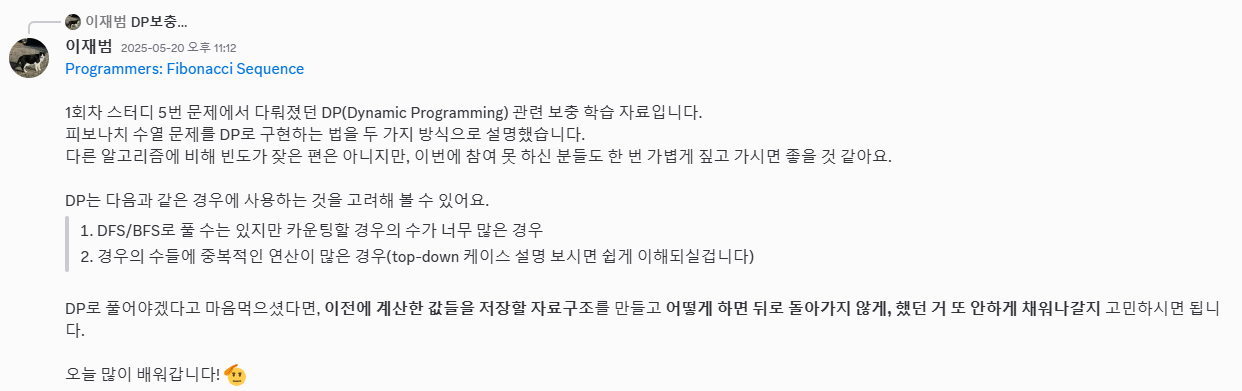 그래서 내린 결론은 "한 놈만 패자"다. 매주 특정 알고리즘 관련 문제만 준비해서, 그 알고리즘만 딥하게 다뤄보는 것이다. 내가 아직 문제만 보면 "아, 이건 DFS구나", "이건 딕셔너리 쓰는 문제구나"와 같이 머릿속에 바로 떠오르는 고수는 아니라 다른 알고리즘의 문제를 잘 못 고를 수 있겠지만, 이 부분은 팀원분들의 너른 양해를 구해야겠다. 어쨌든 누군가와 함께 배운다는 건 즐거운 일이다.